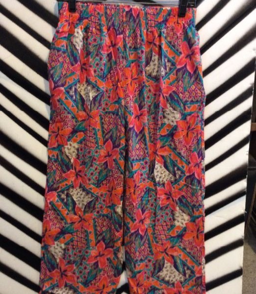 AS-IS AMAZING 1990S ALLOVER GRAPHIC TROPICAL PRINT CAPRI RAYON BEACH PANTS
