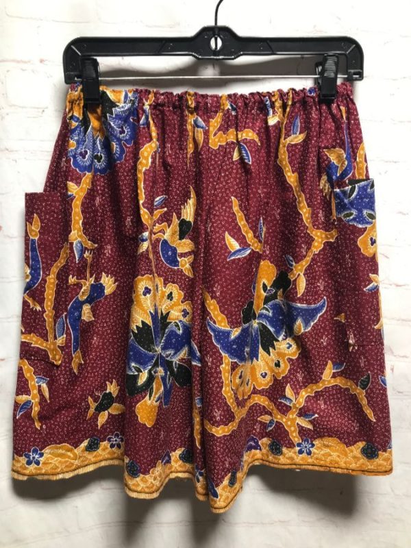 Shorts, elastic waist, flowy, funky Ethnic floral print, side pockets, burgundy/blue/gold/black, size one size fits all