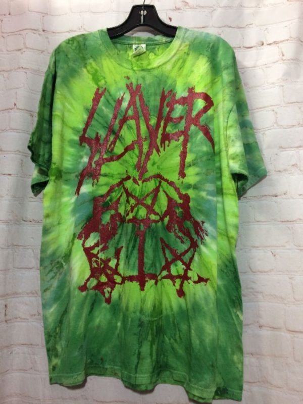 LUCKY T-SHIRT, FUNKY TIE-DYED, SLAYER, SCREEN PRINTED WITH LETTERING & PENTAGRAM FULL FRONT & BACK DESIGNS, GREEN/LIME GREEN/PURPLE, SIZE XL