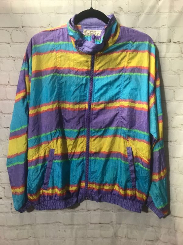 Insan windbreaker jacket, zip-up, nylon, funky jagged edge horizontal striped pattern,Turq/yellow/ green/purple, size M