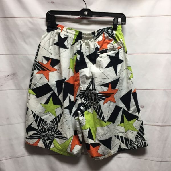 VINTAGE LEG GOONIES BOARD SHORTS, LONG LEG, DRAWSTRING WAIST, FUNKY GEOMETRIC STAR SHAPES DESIGN, WHITE/GREEN/ORANGE/BLACK, SIZE XL AS IS