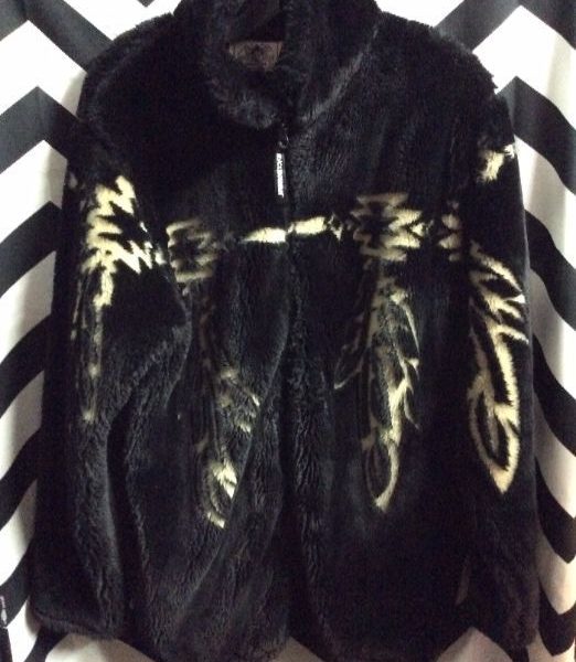 Fleece jacket, zip-up, Native American design of butterfly symbol with hanging feathers, black/white, size M