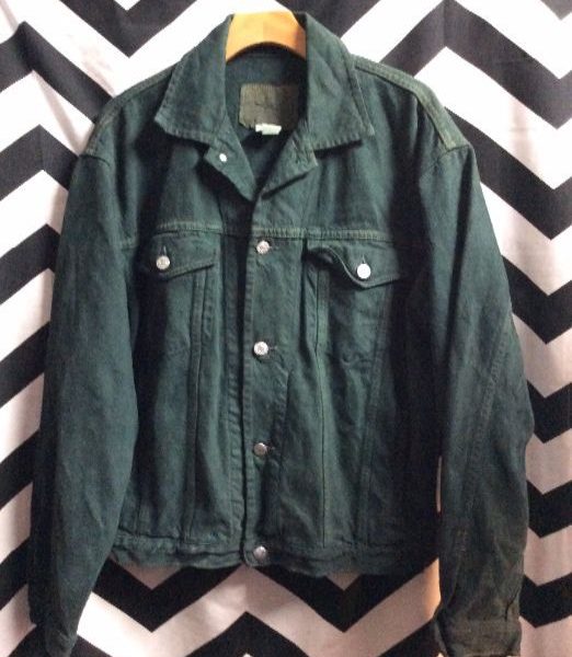 AS-IS REWORKED! CROPPED & DISTRESSED STONEWASH DENIM JACKET, OLIVE DENIM SLEEVES