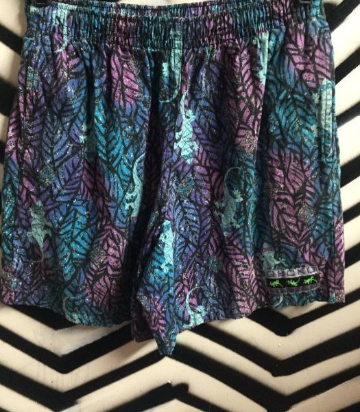 Print board shorts, black/blue/purple gecko and leaf design, size M