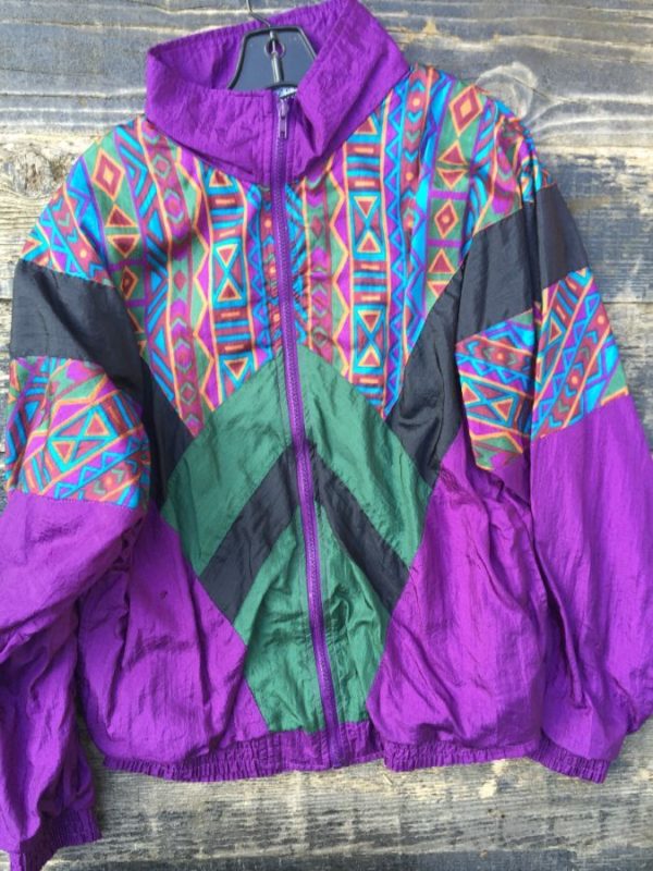 Windbreaker jacket, zip-up, geometric pattern, color-block design, purple/green/black/blue, size L