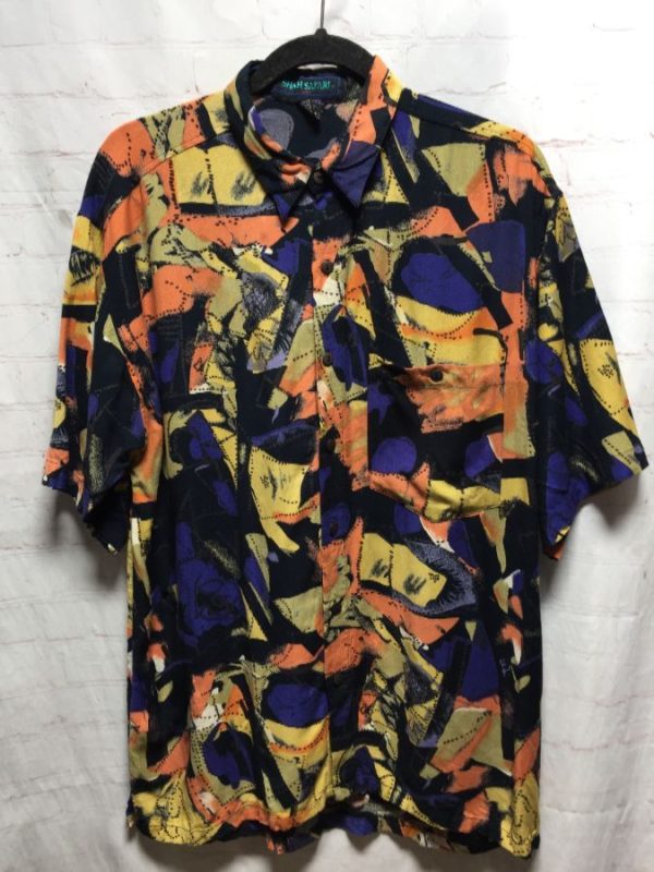 1990’s Shah Safari shirt, rayon, short sleeves, button-up, Fresh Prince, abstract geometric shapes in color-block design, black/purple/orange/tan, size XL