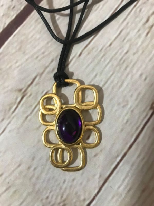 1980’s necklace, gold vermeil pendant, layered geometric shapes with oval jewel, hung on cord, matte-gold/purple/black