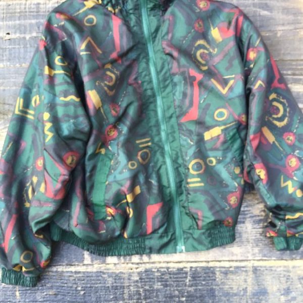 Windbreaker jacket, zip-up, geometric patterned, green/red/tan, size S