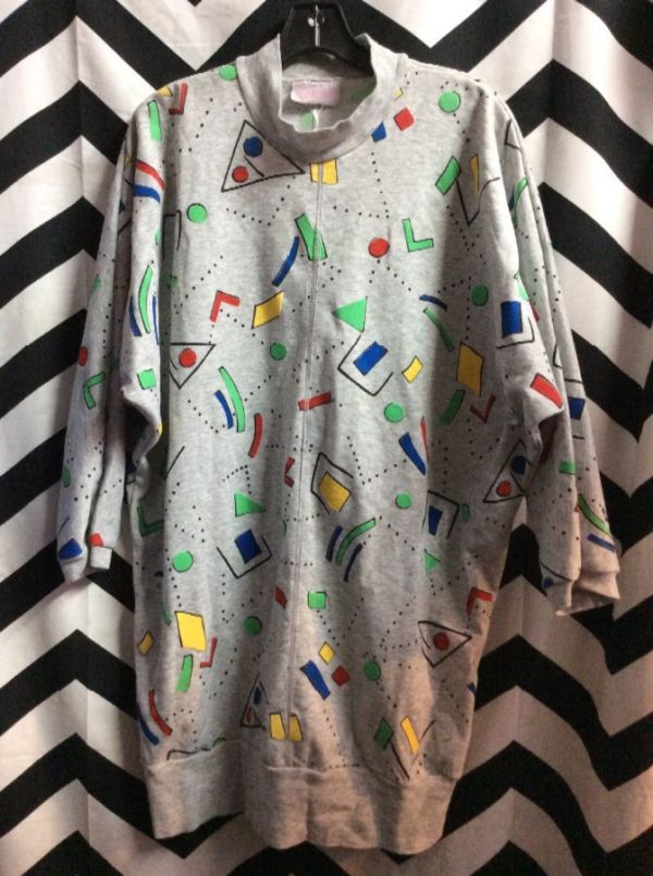Pullover sweatshirt, batwing sleeves, geometric shapes design, gray/green/red/blue, size M
