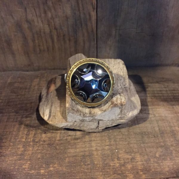 VINTAGE CONFECTION JEWELS RING, COCKTAIL RING, ART DECO, GERMAN POWER CRYSTAL, GLASS BUTTON, GOLD METAL MOUNTING, GOLD/SILVER, SIZE ADJUSTABLE