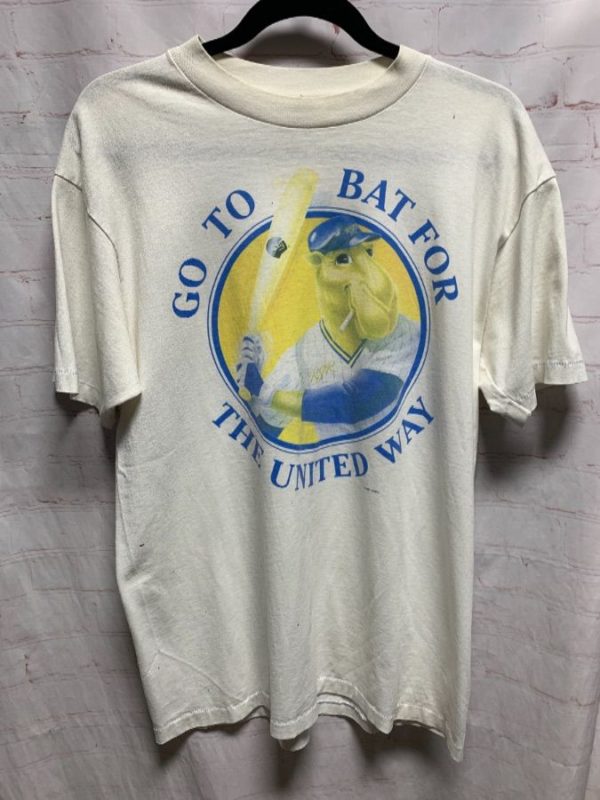 Hanes T-shirt, 50/50 cotton/polyester, Joe Camel #7, Go To Bat For The United Way, screen printed Joe Camel at bat graphic, white/blue/yellow, size L