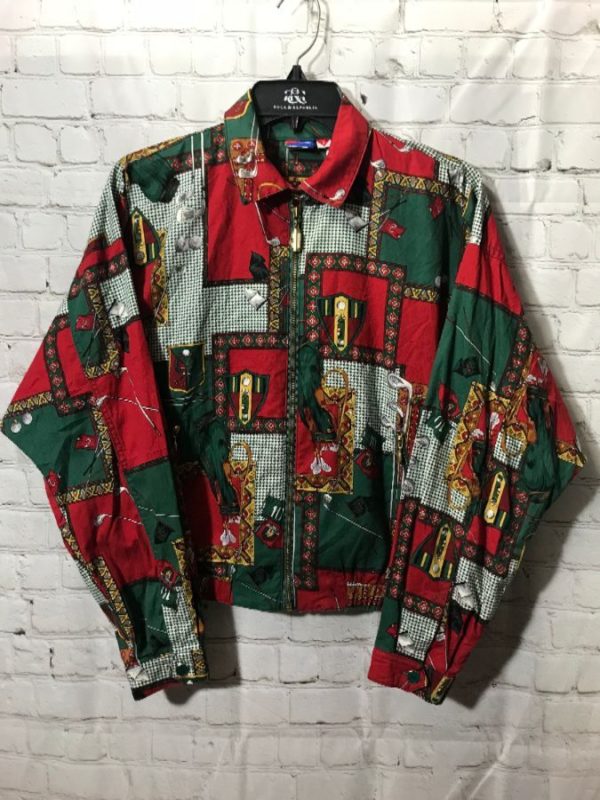 Windbreaker jacket, cotton, zip-up, golf themed, Baroque pattern, red/green/yellow/white, size S
