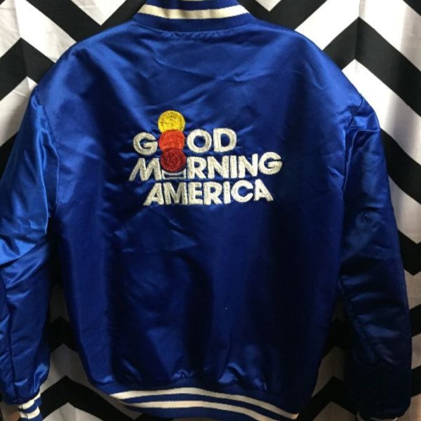 Sport jacket, satin, snap-up, Good Morning America, chain stitch embroidered back design, embroidered front lettering on chest, striped collar/cuffs/hem, blue/white/yellow/orange/red, size M