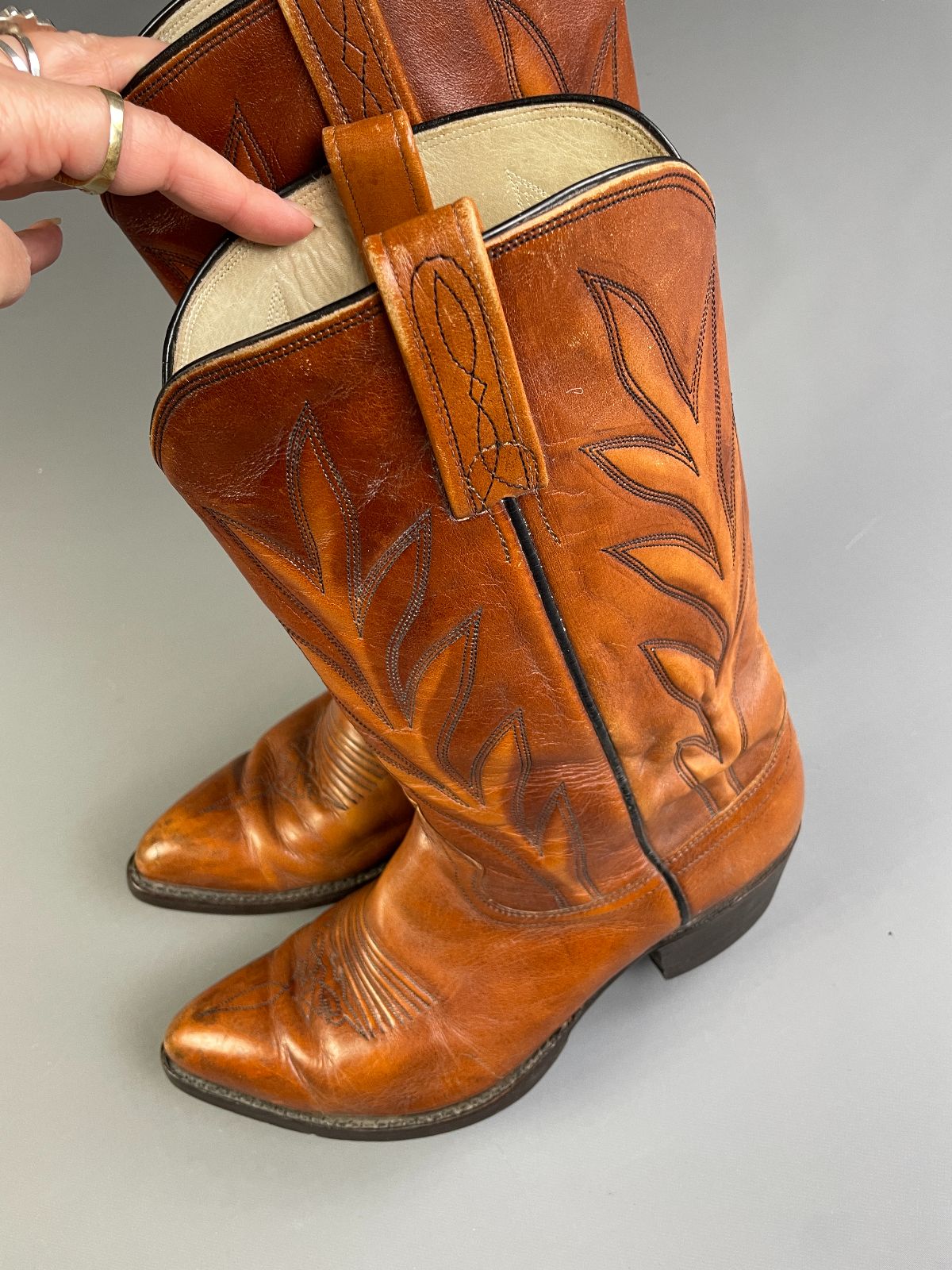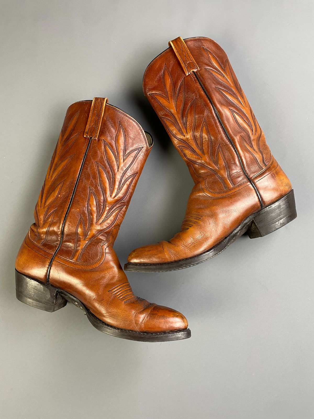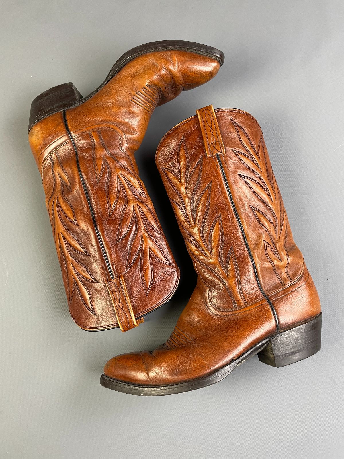 GORGEOUS!!! COGNAC LEATHER ALMOND TOE COWBOY BOOTS, EMBOSSED LEAF DESIGN