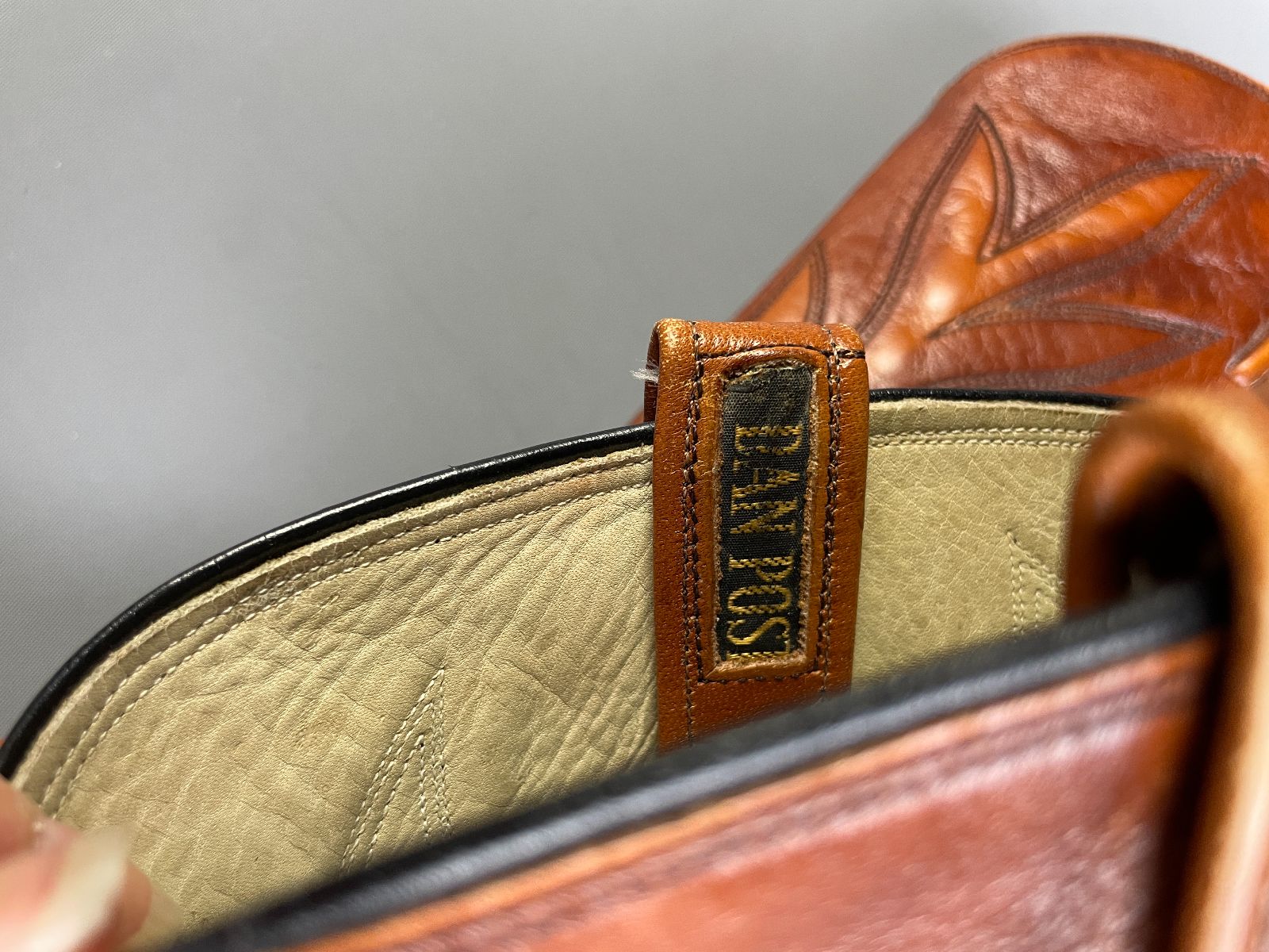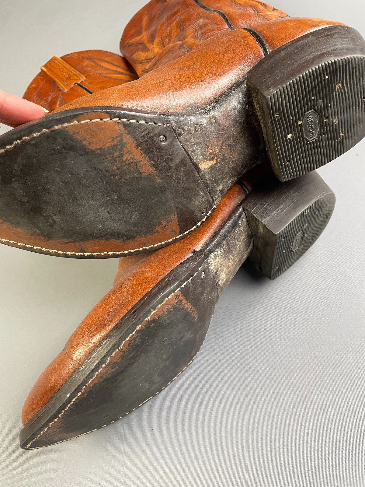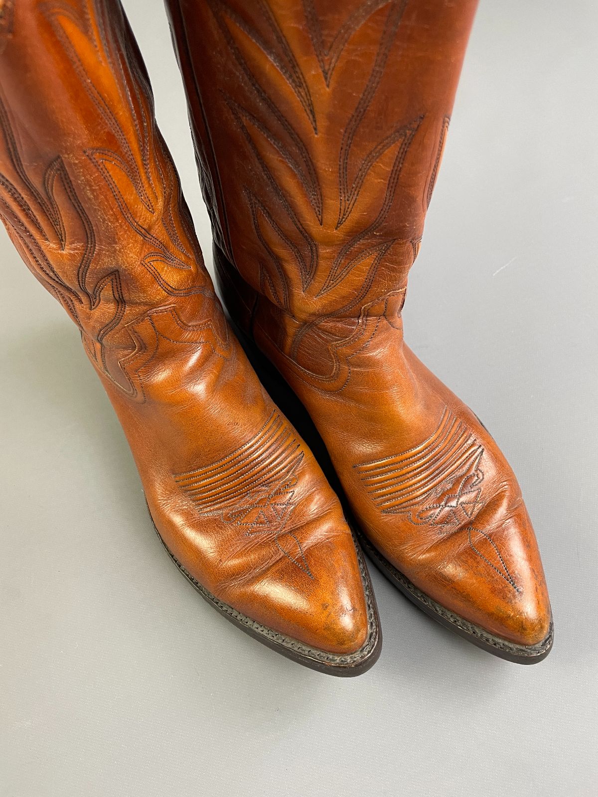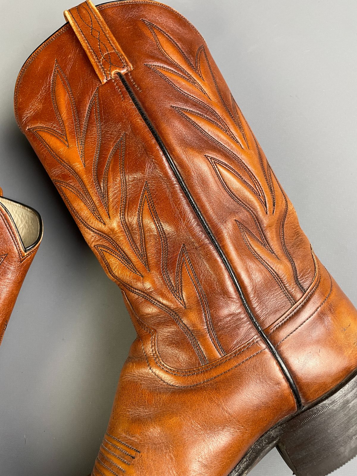 GORGEOUS!!! COGNAC LEATHER ALMOND TOE COWBOY BOOTS, EMBOSSED LEAF DESIGN