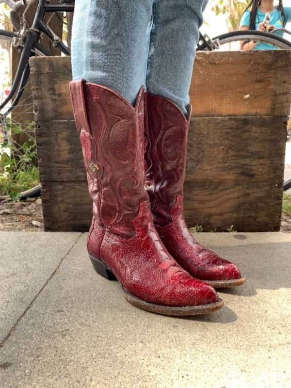 Los Altos Boots cowboy boots, high tops, walking heel, genuine ostrich, leather uppers with raised flame design, gorgeous, maroon, size 7