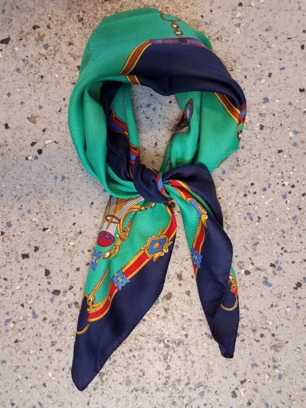 Gil De Losne Paris scarf, silk, square shaped, balloon & Hermes style aeroplane print, gorgeous, medium blue/navy blue/green/yellow/white/red