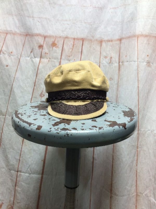 Golden Fleece Designs Greek Fisherman’s cap, corduroy, embroidered ribbon around brim, braid around cap front, tan/brown, size 6 7/8