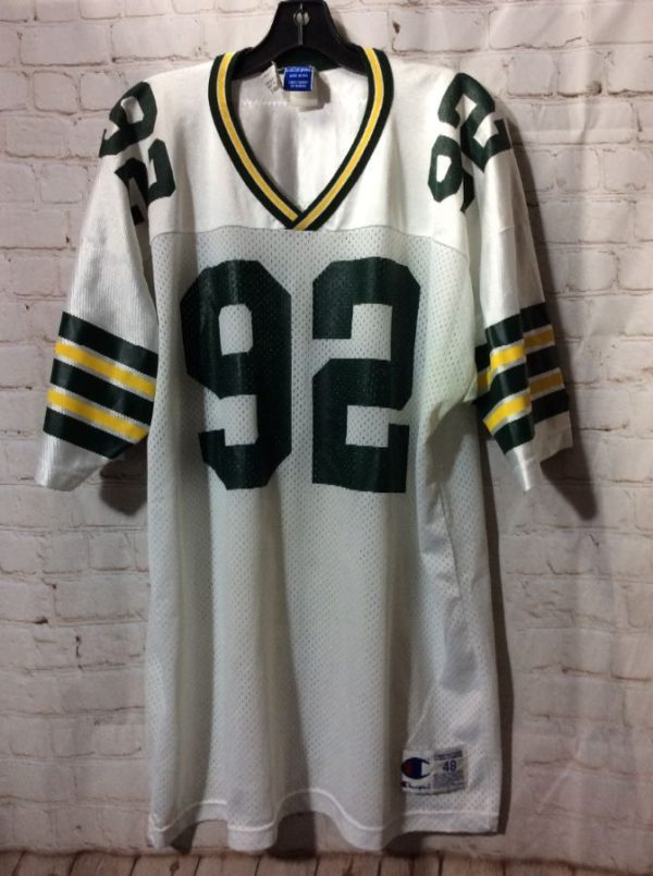 Champion football jersey, v-neck, Green Bay Packers, Reggie White #92, striped trim on neck & sleeves, NFL, white/yellow/green, size 48