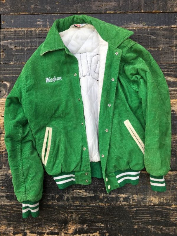 Sports jacket, button-up, corduroy, contrasting trim, Edina lettered on back, green/white, size S