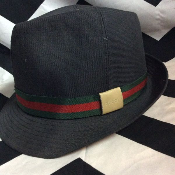 Gucci hat, Fedora style, monogram patterned lining, leather badge on hat band, black/red/green/gold, size M