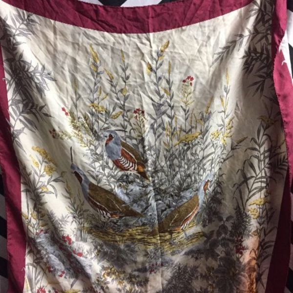Gucci scarf, silk, pheasant print design, contrasting colored boarder, creme/maroon
