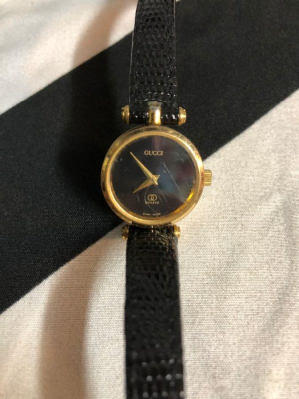 Gucci watch, skinny styling leather strap, gold metal bezel & hands, black/gold, size S