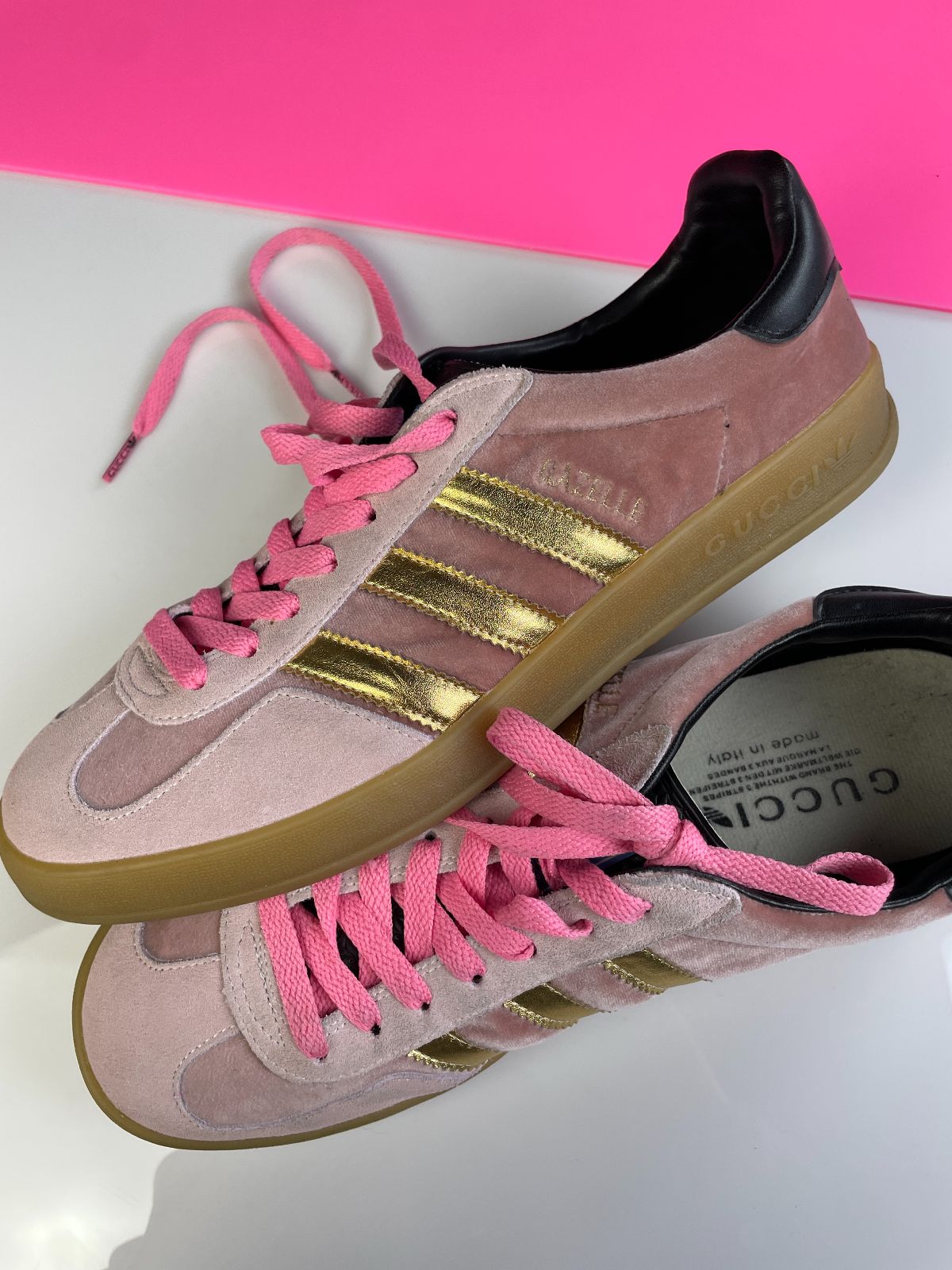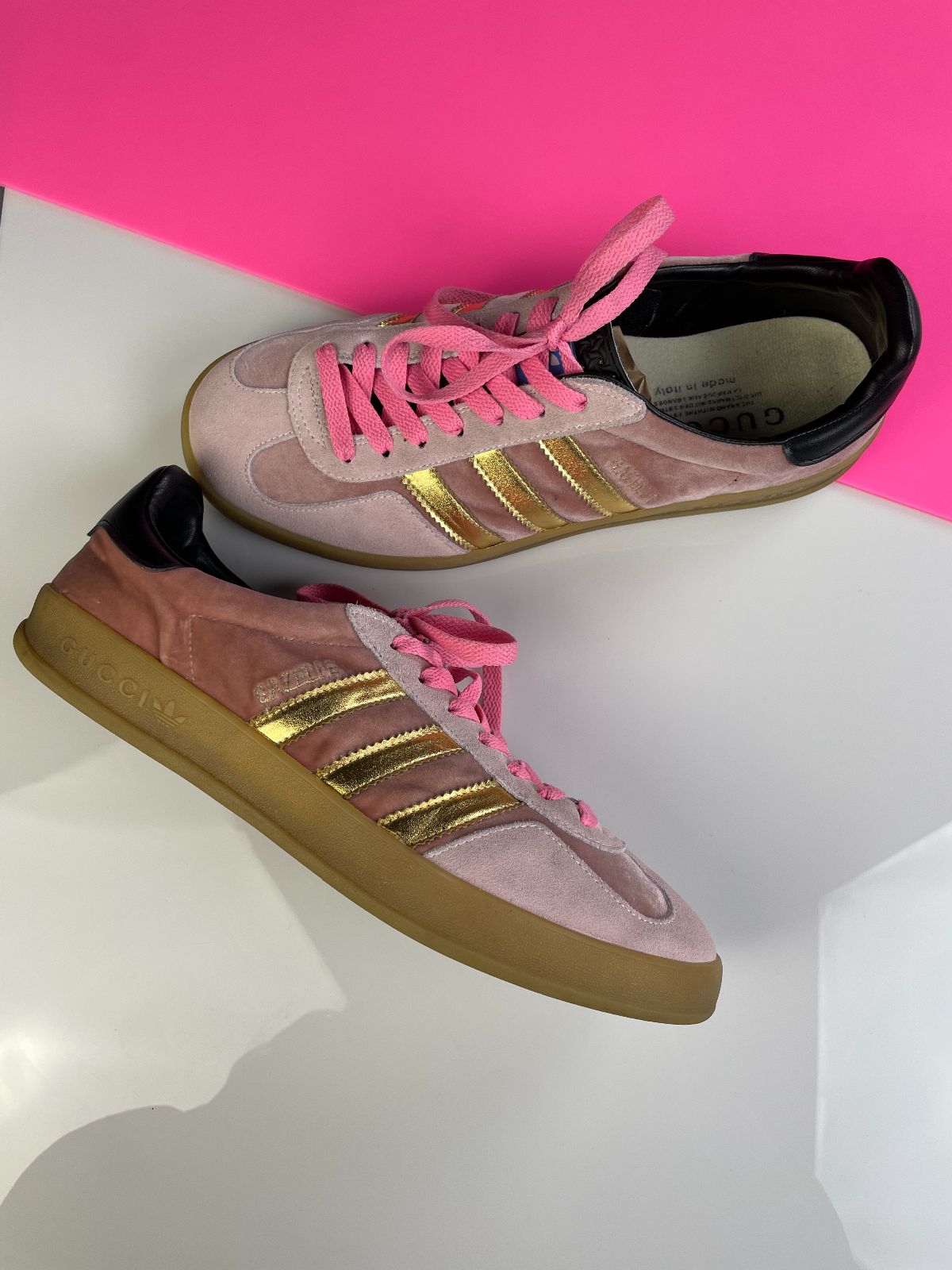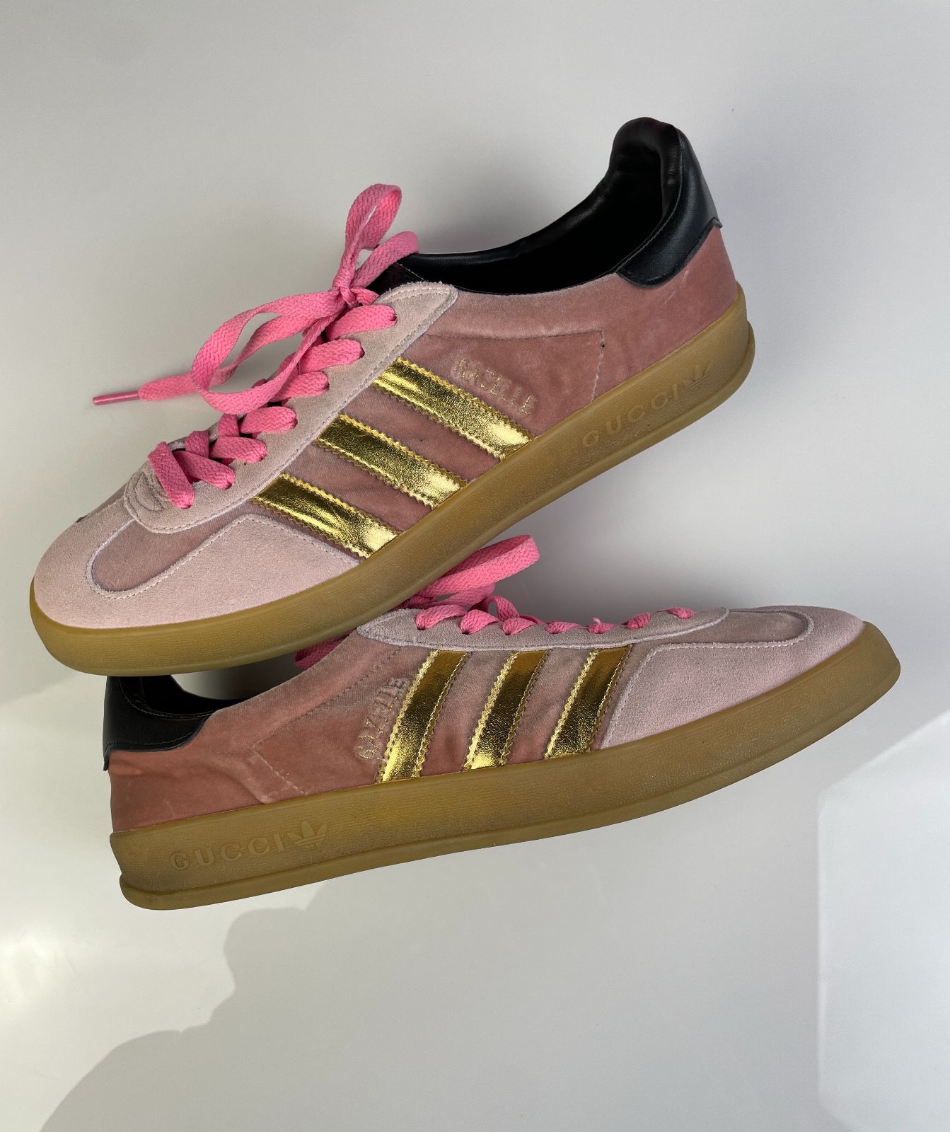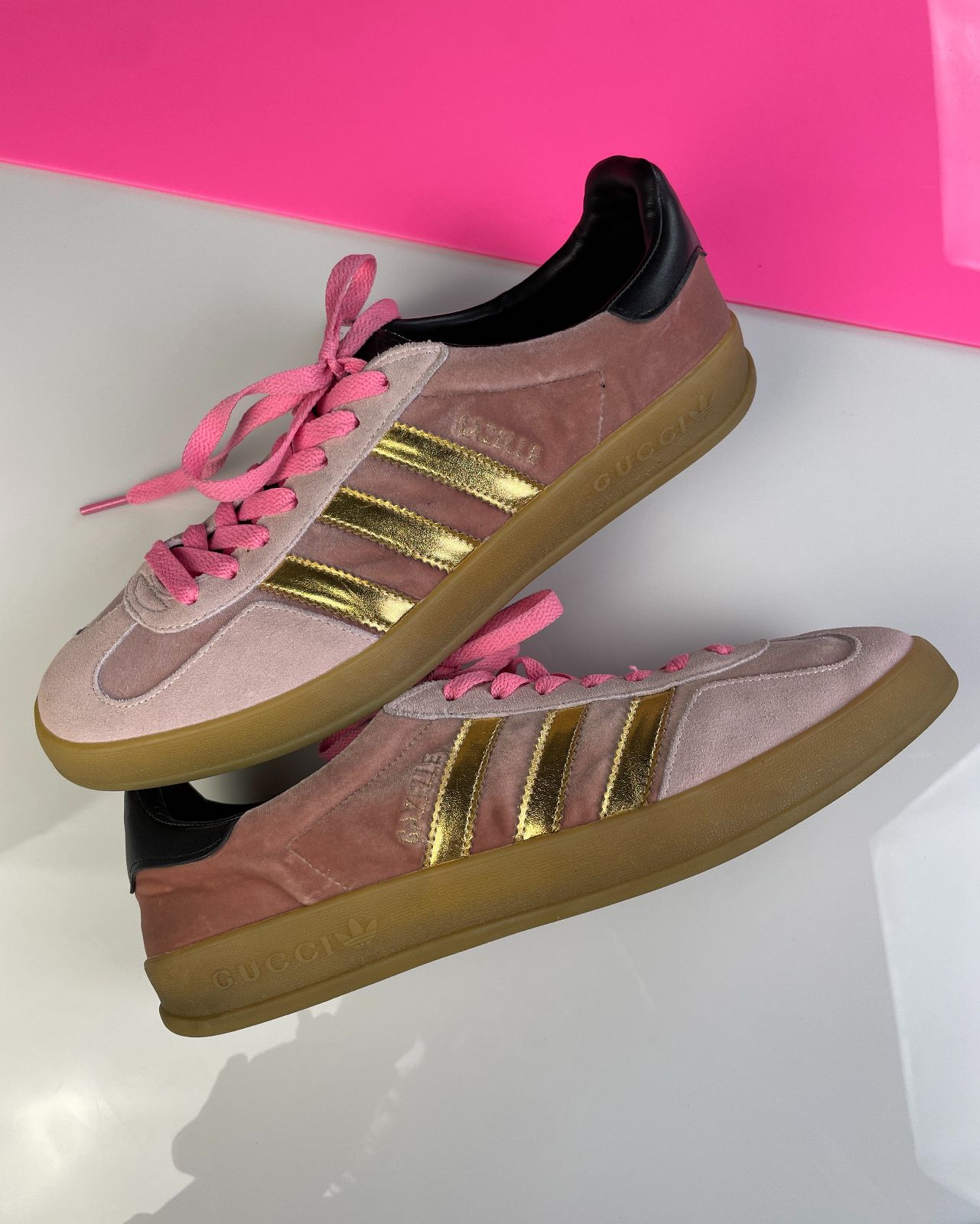 GUCCI X ADIDAS GAZELLES PINK VELVET GUMSOLE SNEAKERS