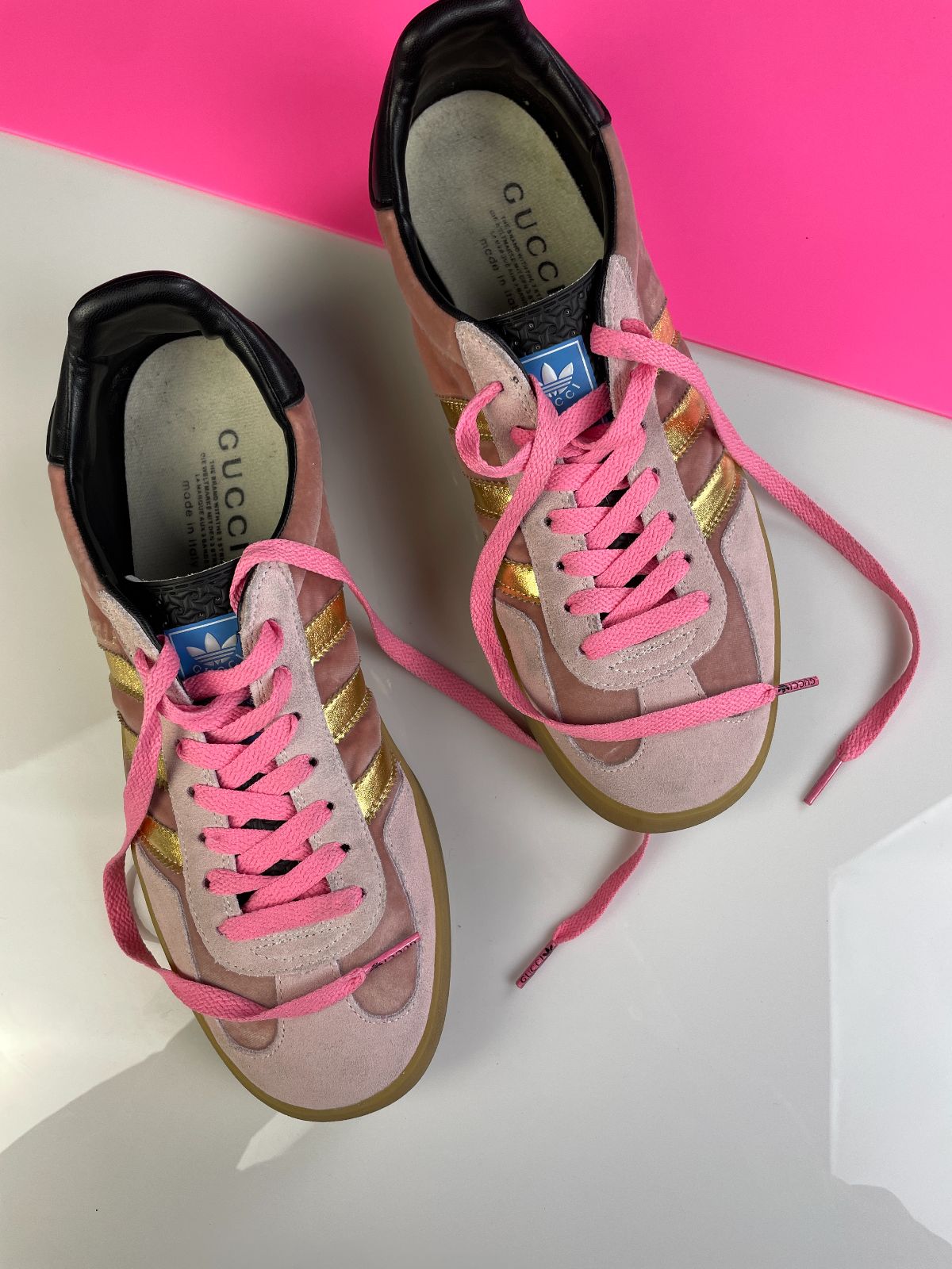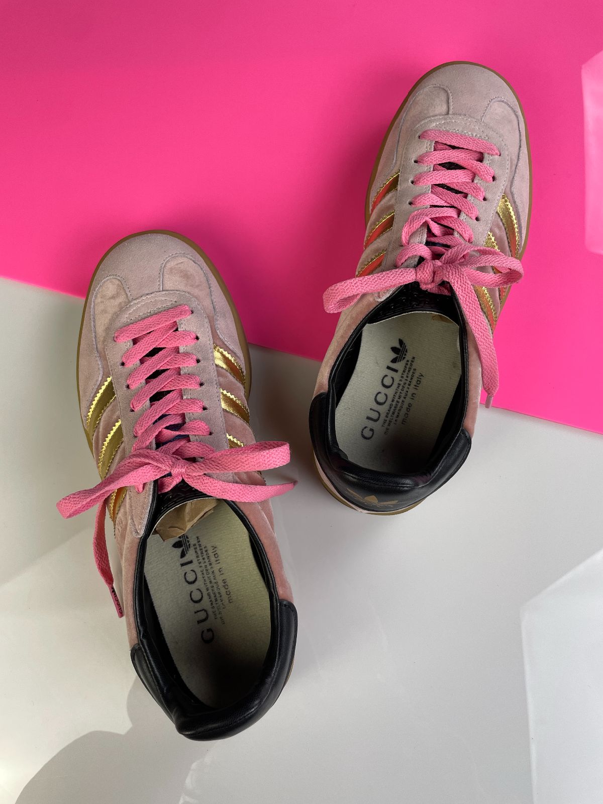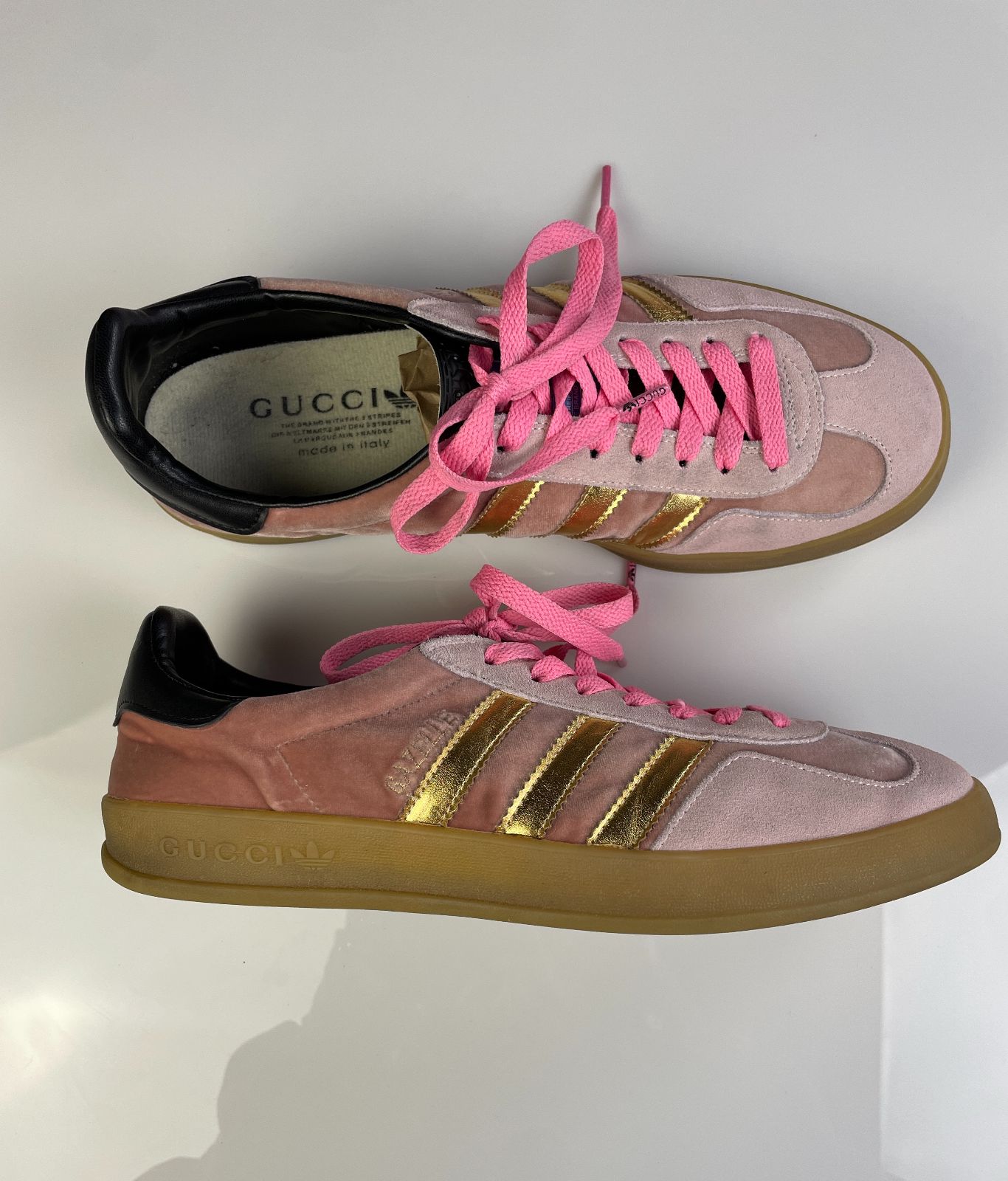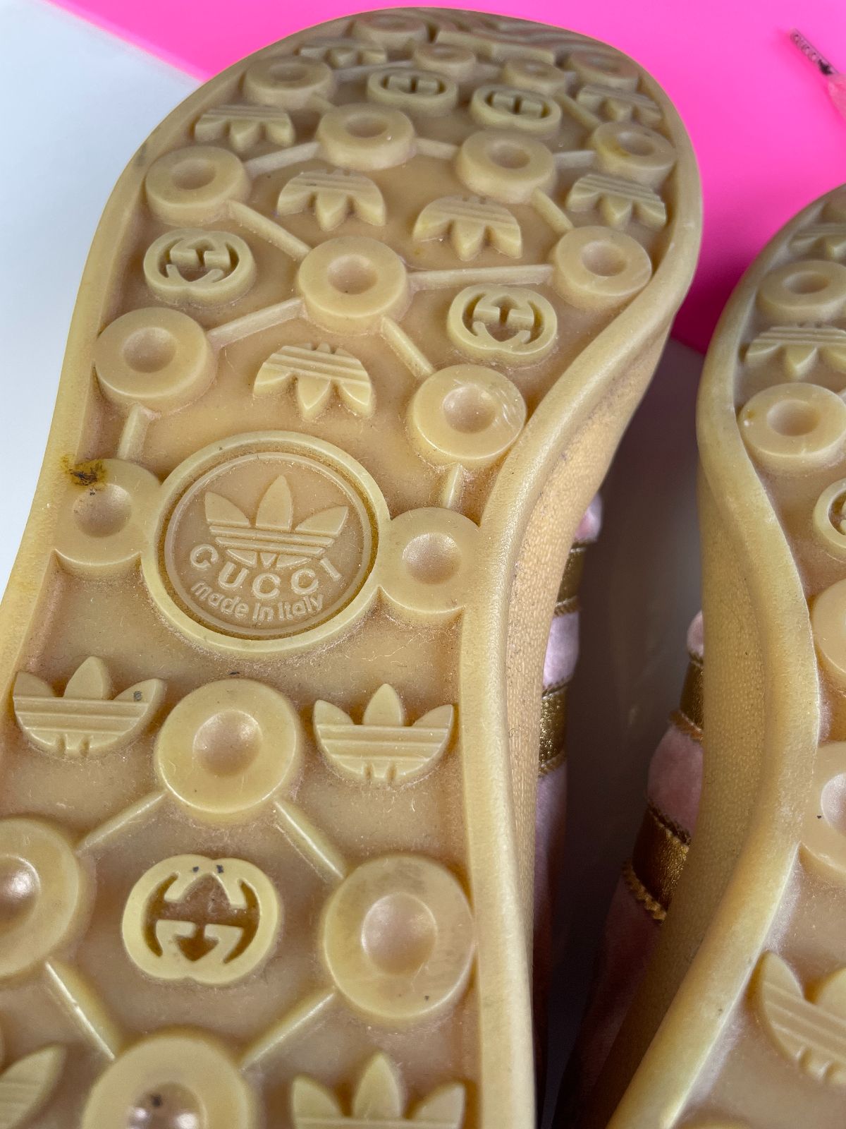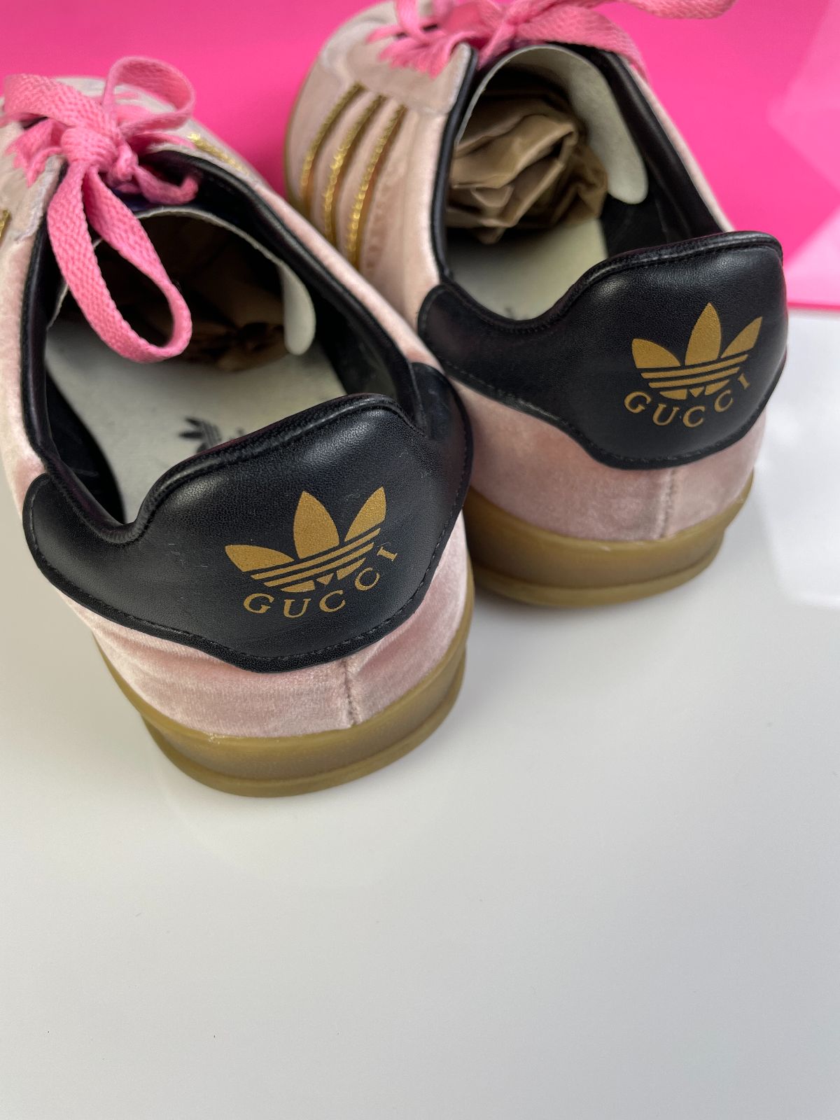 GUCCI X ADIDAS GAZELLES PINK VELVET GUMSOLE SNEAKERS