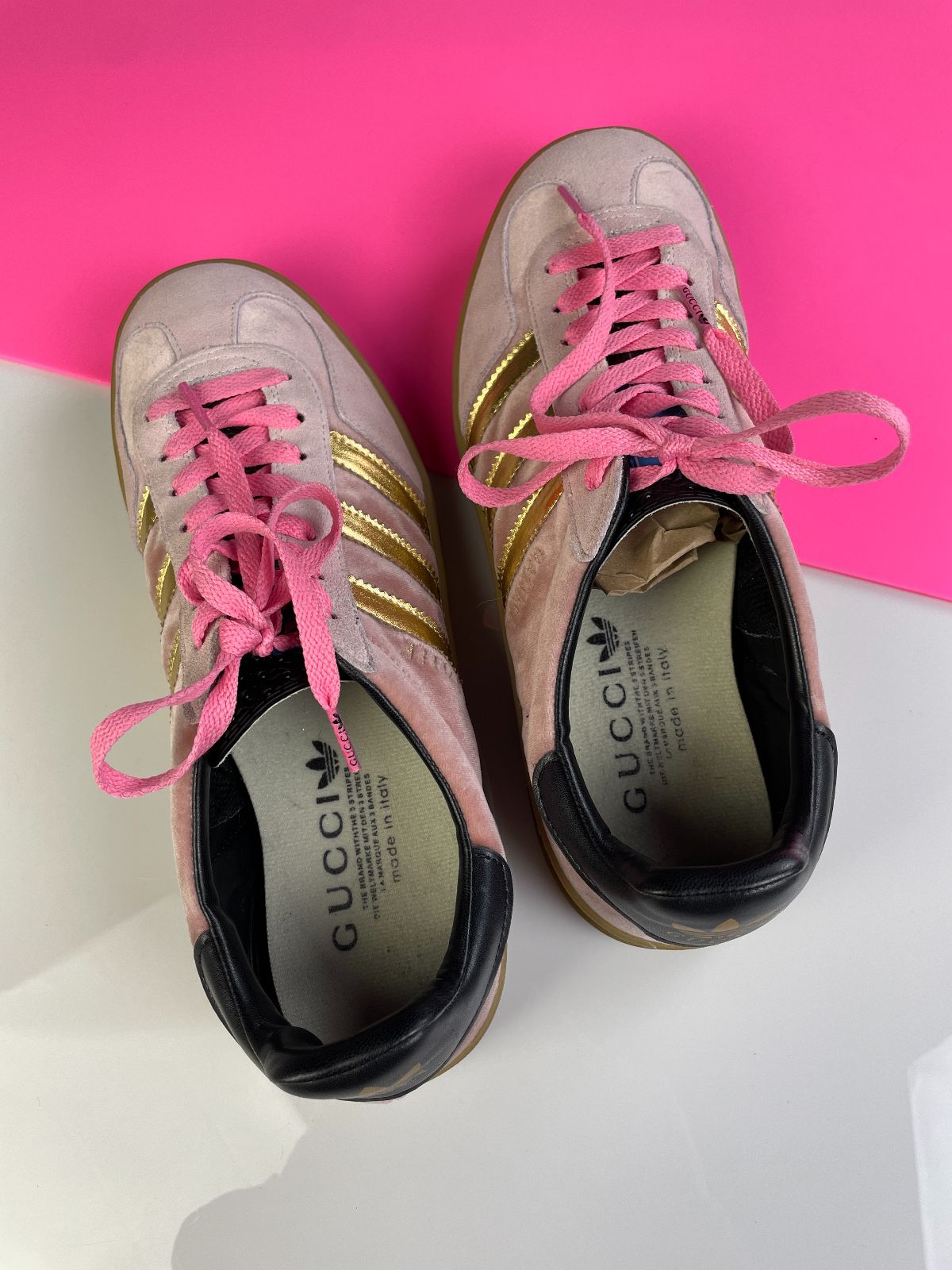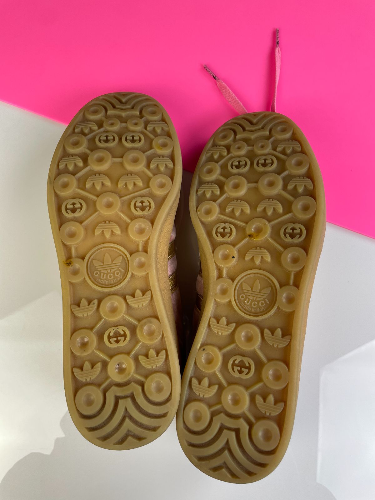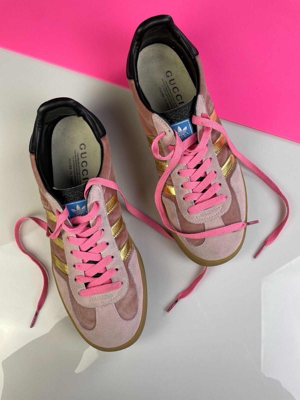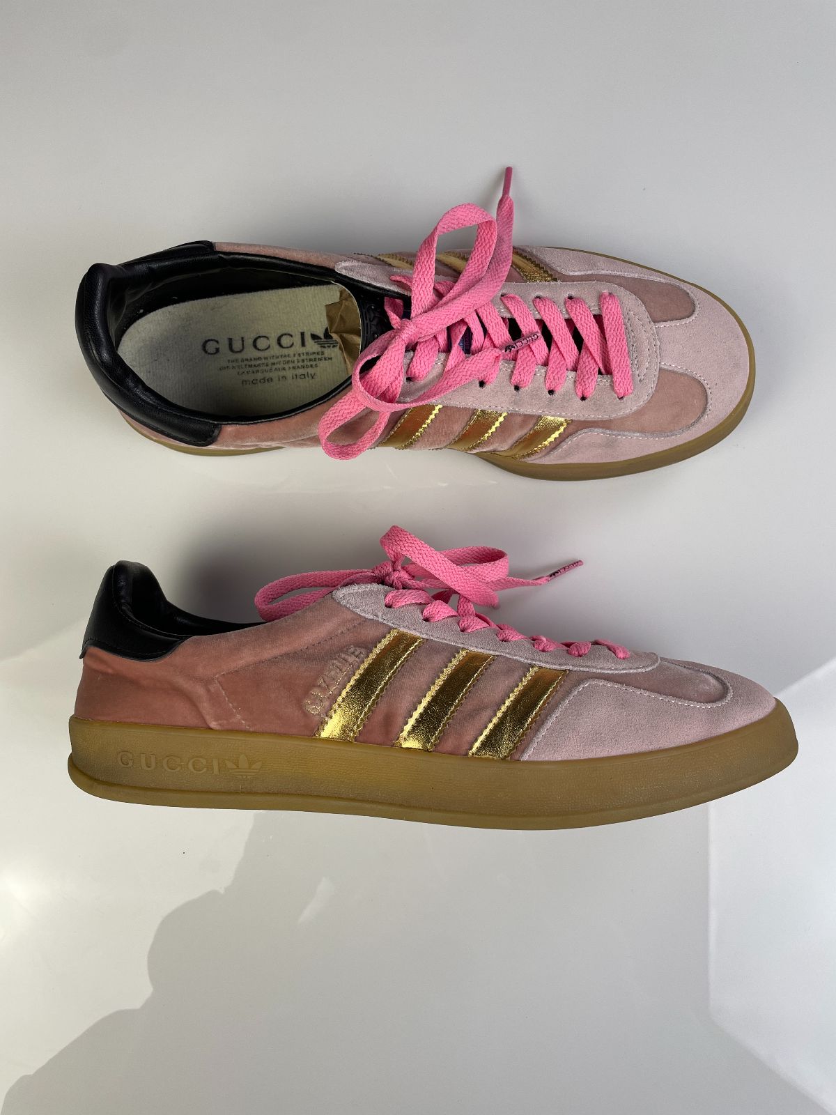 GUCCI X ADIDAS GAZELLES PINK VELVET GUMSOLE SNEAKERS
