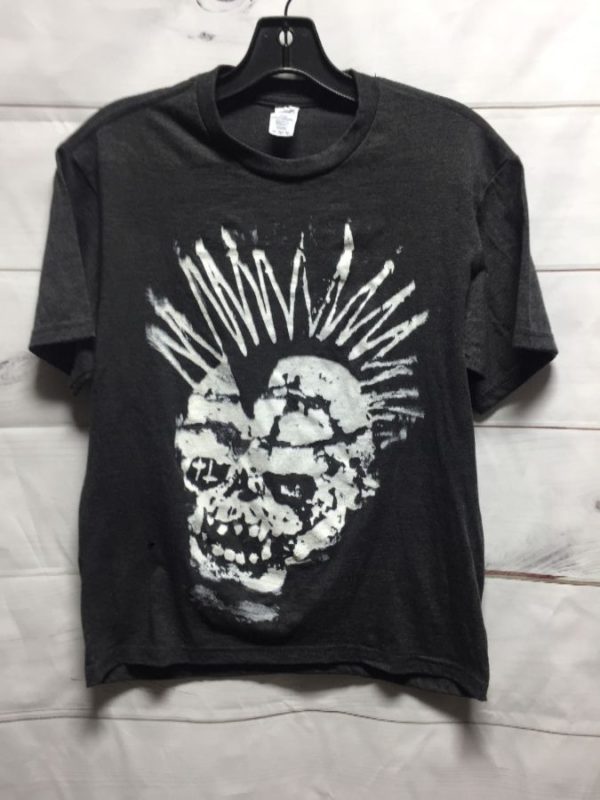 T-SHIRT, GUTTER PUNK SKULL, MOHAWK HAIR-DO, SCREEN PRINTED FRONT GRAPHIC, FADED BLACK/WHITE, SIZE S SMALLER FIT
