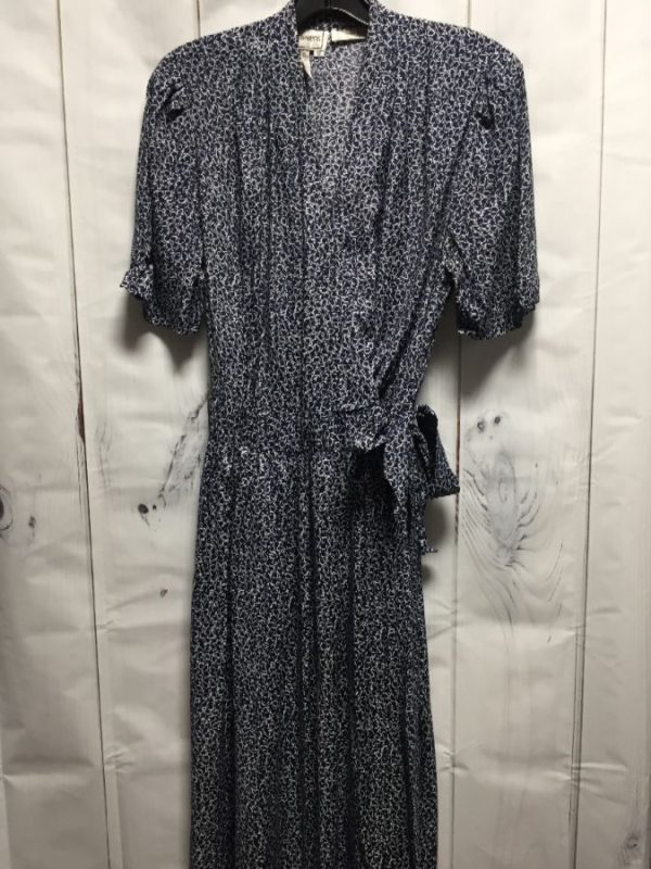 Karin Stevens dress, rayon, short sleeves, half wrap front, side knot closure, little leaf print, white/navy blue, size 12