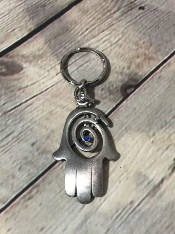 Key-chain, Hamsa hand in silver metal with blue center stone, silver/blue