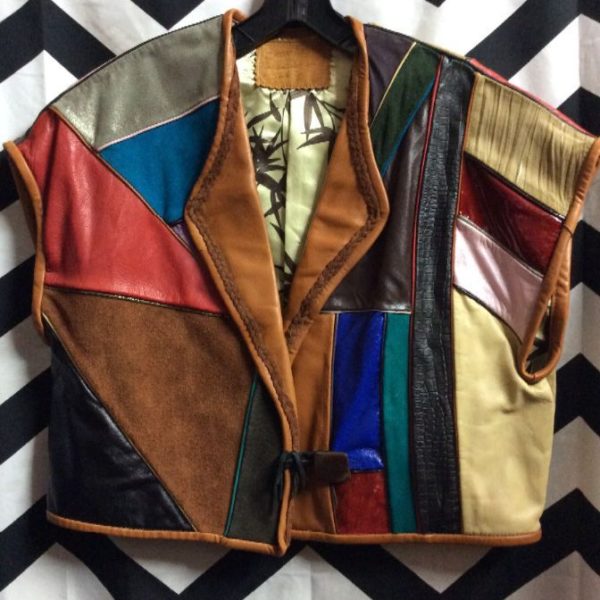 HAND CRAFTED LEATHER W/PATCHWORK VEST & BAMBOO PRINT LINING