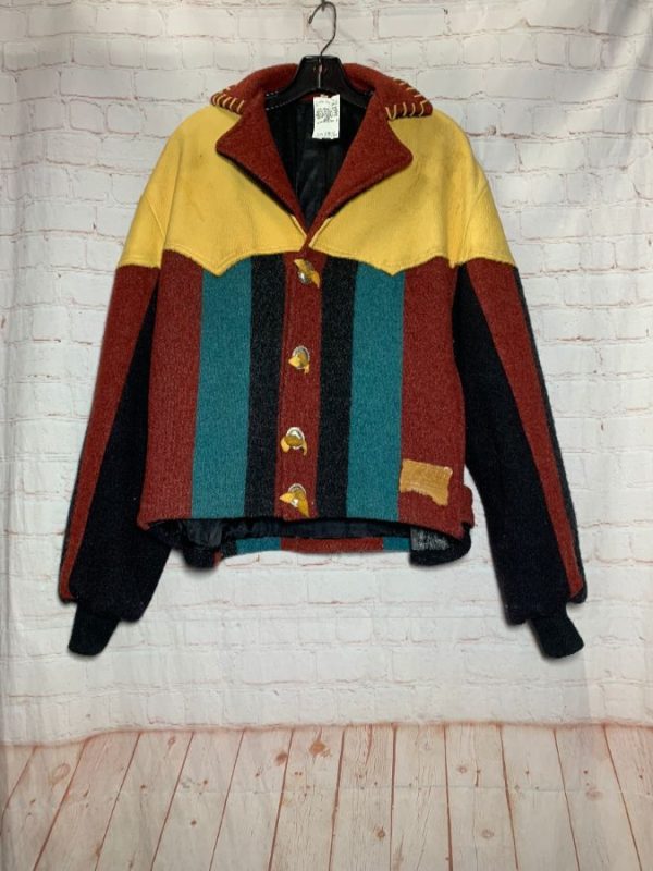 Vintage Wa Kina Western jacket, wool & buckskin leather, button-up with silver conchos, whip-stitched around collar, hand made, leather shoulder area with vertical striped color block design on sleeves & from chest down, knit cuffs, tan/blue/black/rust, size S