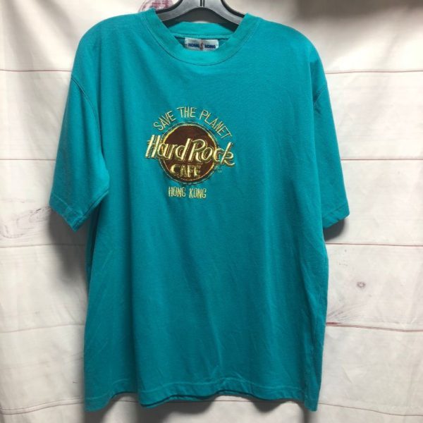 Hong Kong T-shirt, Hard Rock Cafe, Save The Planet, embroidered front design, metallic thread, blue/black/white/gold