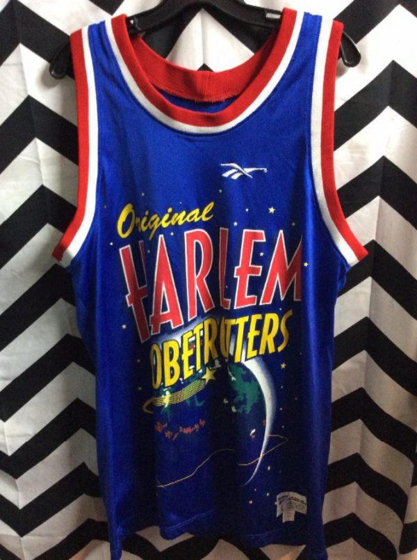 Reebok basketball jersey, original Harlem Globe Trotters, #12 Hobley, screen printed designs front and back, blue/red/yellow/white, size L