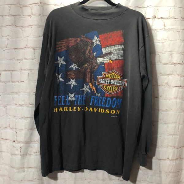 Harley Davidson T-shirt, cotton, pullover, long sleeves, super soft, Feel The Freedom, screen printed American flag & flying eagle with lettering full front & sleeve, black/red/white/blue/yellow/brown, size L