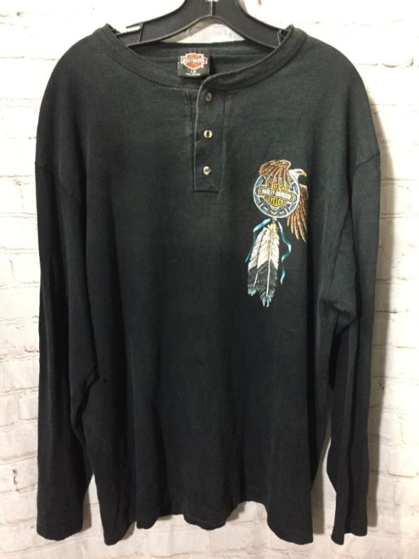 Harley Davidson sweatshirt, pullover, 1/4 button-up, Sun Harley-Denver CO., eagle with shield & feathers front graphic, eagle/logo/lettering/arc back design, screen printed designs front & back, black/orange/white/multi, size XL
