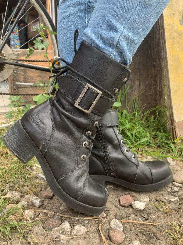 Harley Davidson boots, leather, side zippers, lace-up, mid calf height, chunky heel, wide wrap-around strap with side buckle, black/silver, size 8.5