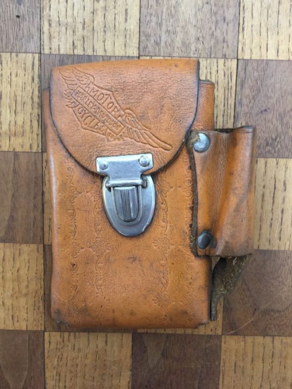 Harley Davidson cigarette holder, leather, side pouch for lighter, Harley wing logo, push button latch, belt loop, tan/silver, size one size As is