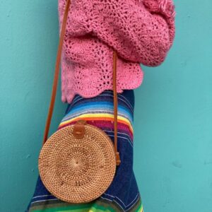 CIRCULAR ROUND WICKER BASKET WEAVE PURSE LEATHER DETAILS