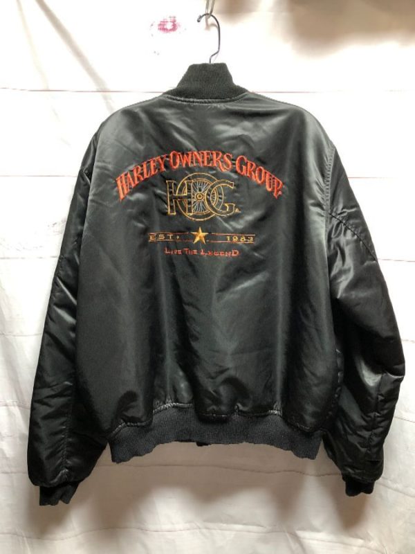 Harley Davidson bomber jacket, nylon, zip-up, front chest leather embossed patch, Harley Owners Group, Live the Legend, embroidered logos & lettering, black/red, size XL As is