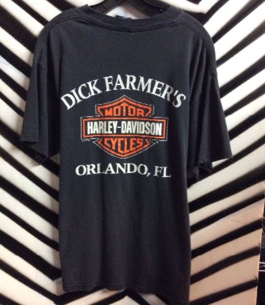 Dick Farmer’s Harley Davidson pocket T-shirt, black shirt with silk screened pocket and full back designs