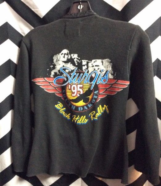 Harley Davidson sweatshirt, zip-up front, leather trim, screen printed eagle design full front & Sturgis ’95 Black Hills Rally full back design, black/white/multi