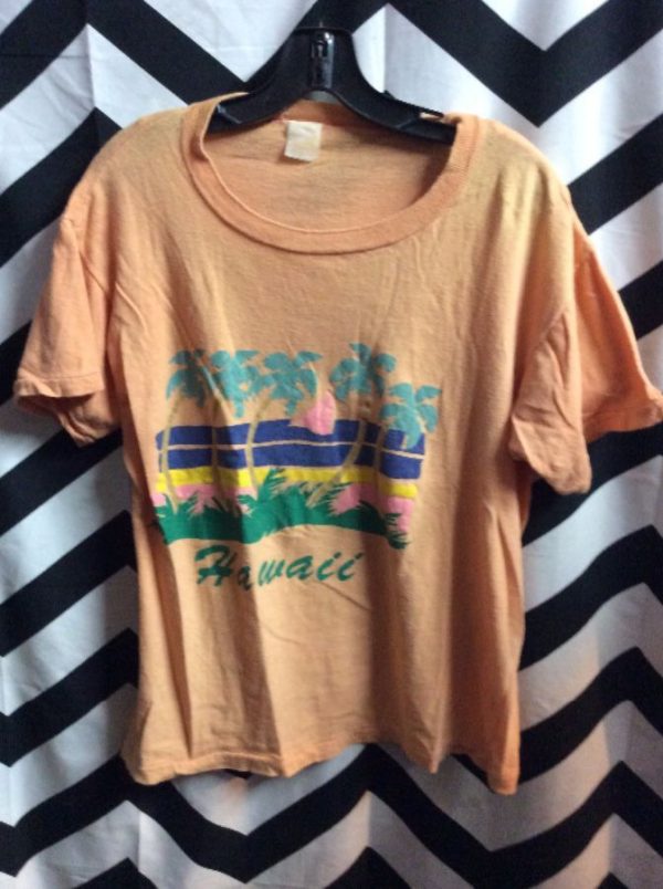 T-shirt, Hawaii, screen printed ocean/sailboat/palm trees design, peach/green/pink/yellow/blue