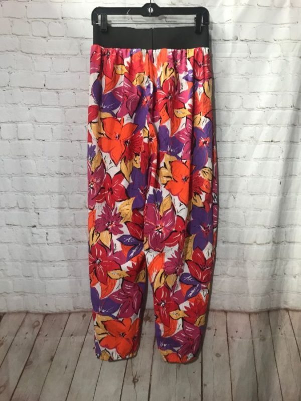 Pants, flowy, elastic waist, cinched at ankles, Hawaiian floral print, dead-stock, purple/pink/orange/yellow/white/black, size S