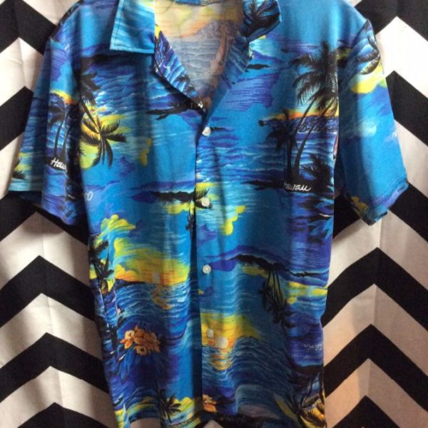 HAWAIIAN SHIRT – POLYESTER – PALM TREE PRINT W/HAWAII IN SCRIPT
