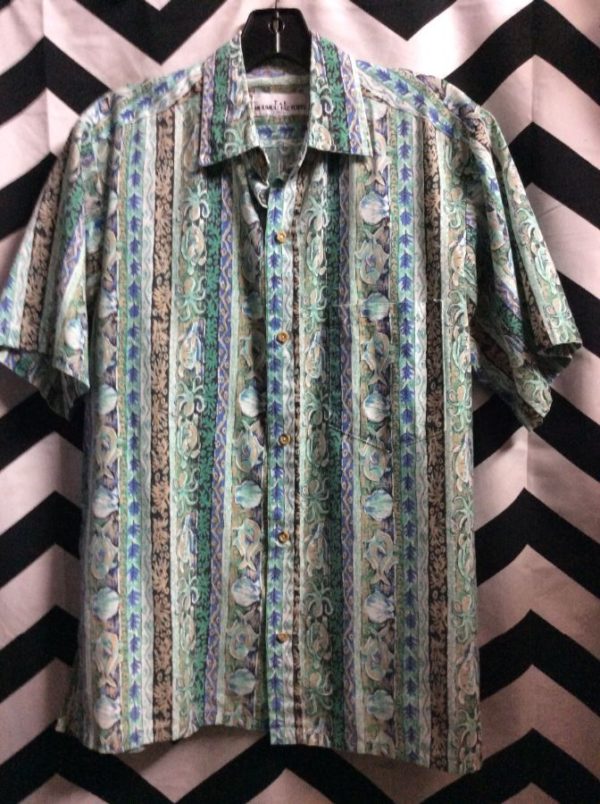 HAWAIIAN SHIRT VERTICAL STRIPES W/ OCEAN-LIFE PATTERN