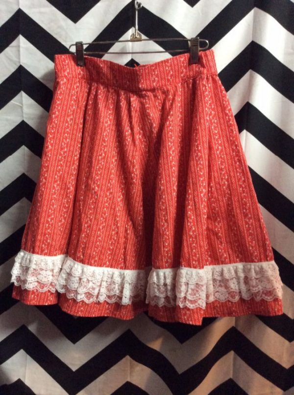 Skirt, full, hearts & flowers pattern, lace trim, red/white, size 30